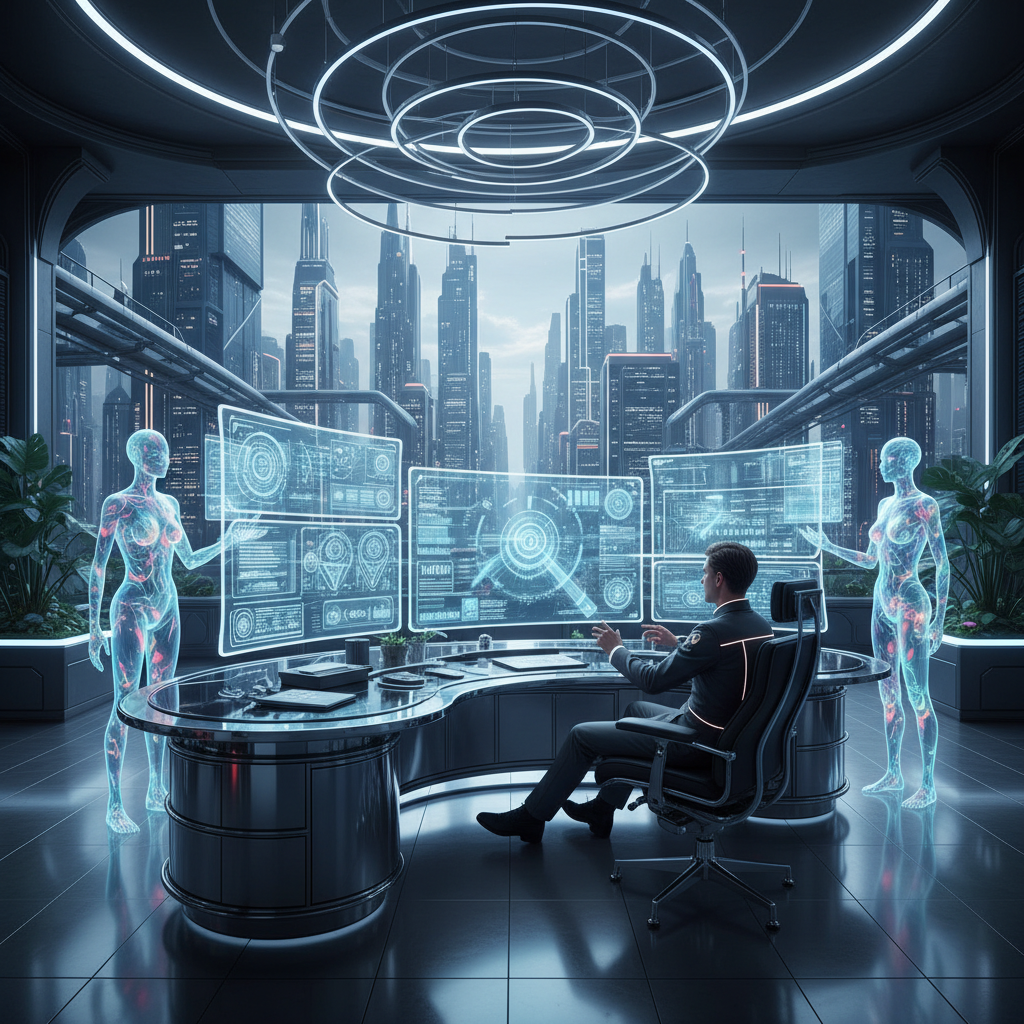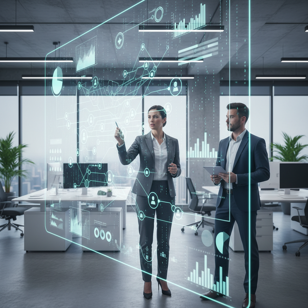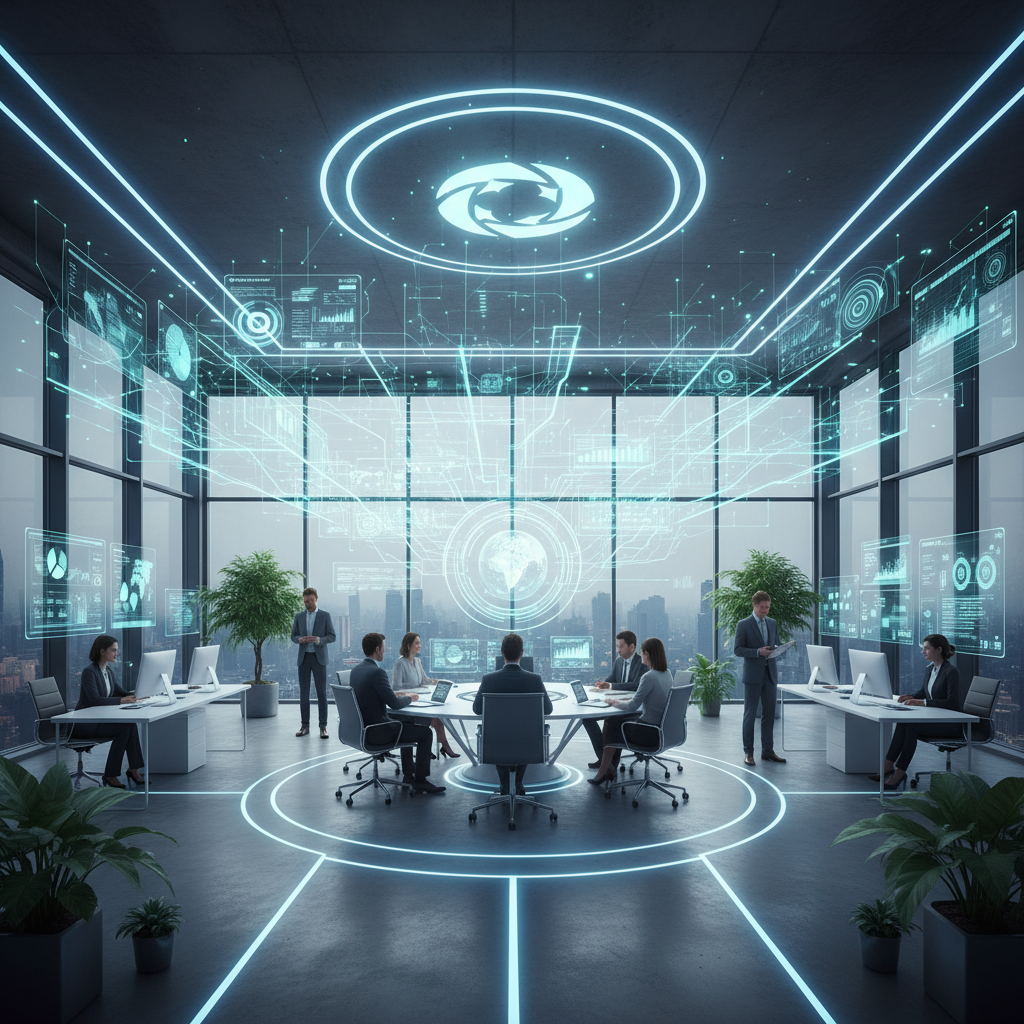 Alt text: Information processor shaping enterprise workflow with unseen data streams in a modern office.