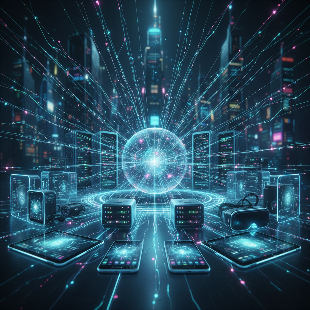 Alt text: Ecosystem around information processors, digital devices networked by glowing data lines.
