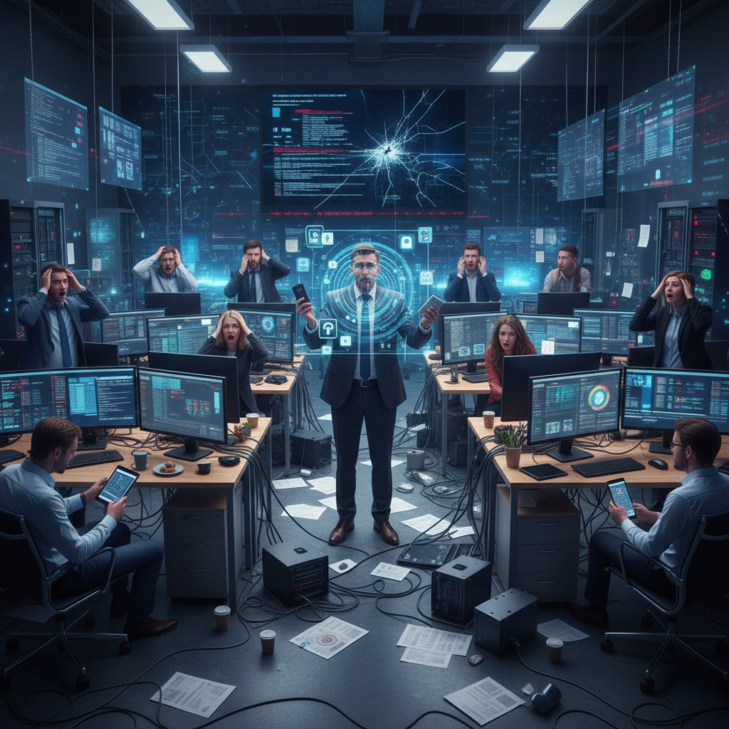 Alt text: Enterprise team grappling with information overload, chaotic workspace