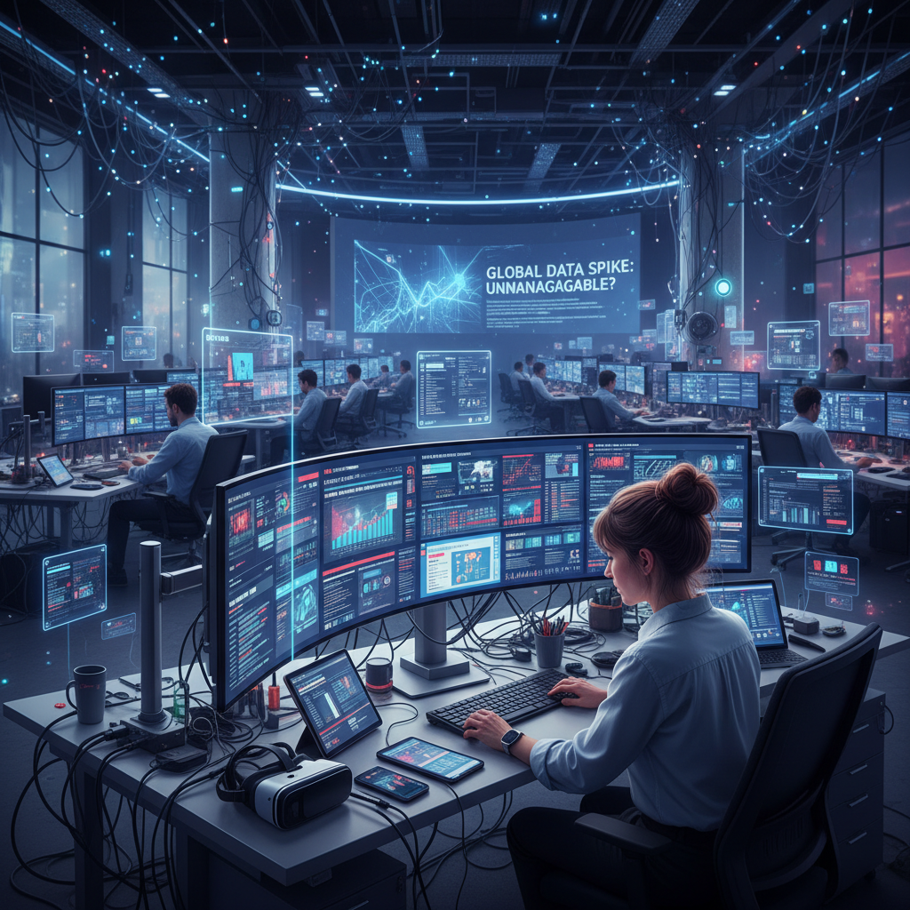 Alt text: Modern office with digital data overwhelming researchers, information researcher struggling with data overload