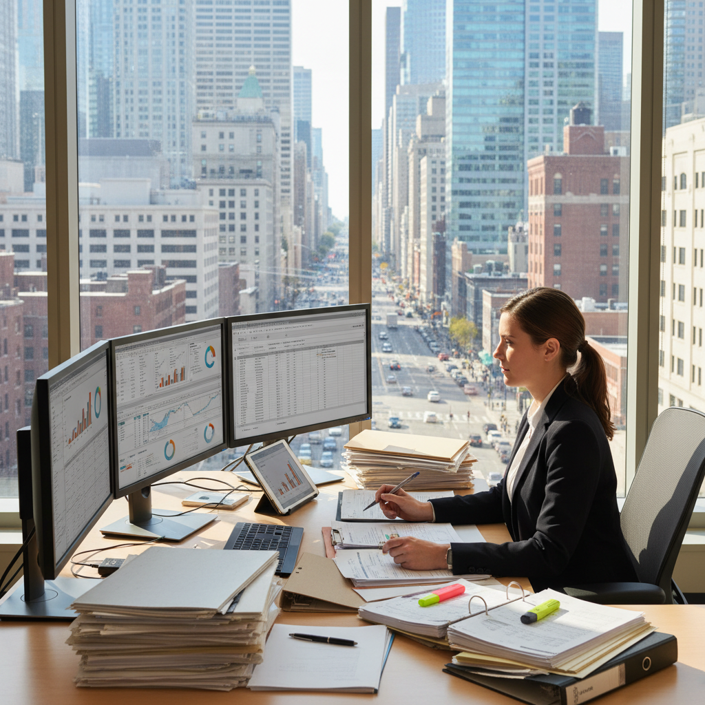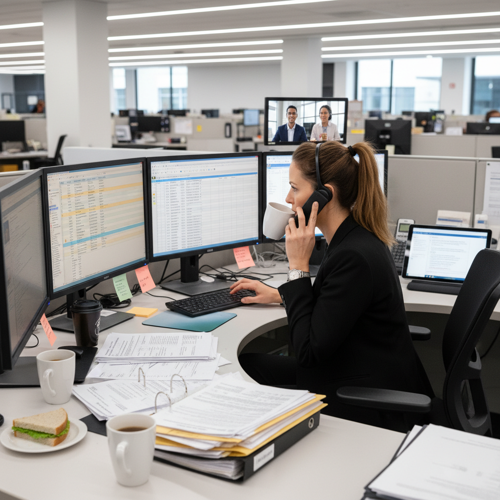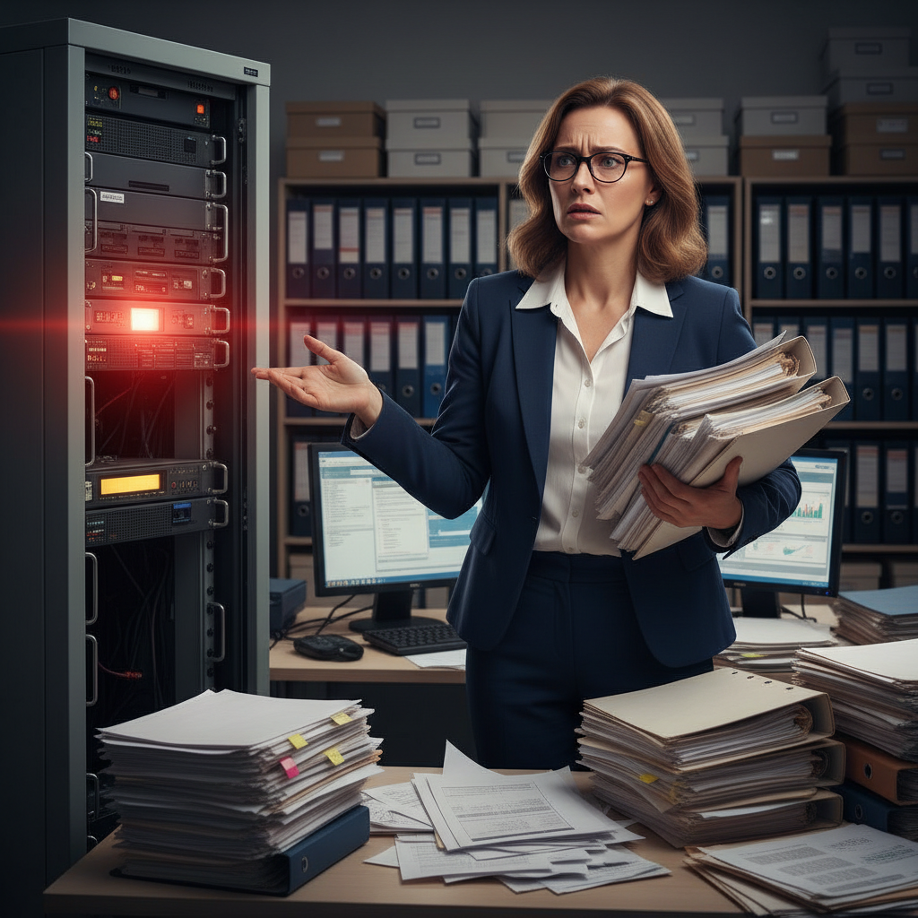 An insurance administrator balances analog paperwork and digital platforms, a visual metaphor for the complex reality of modern risk management.