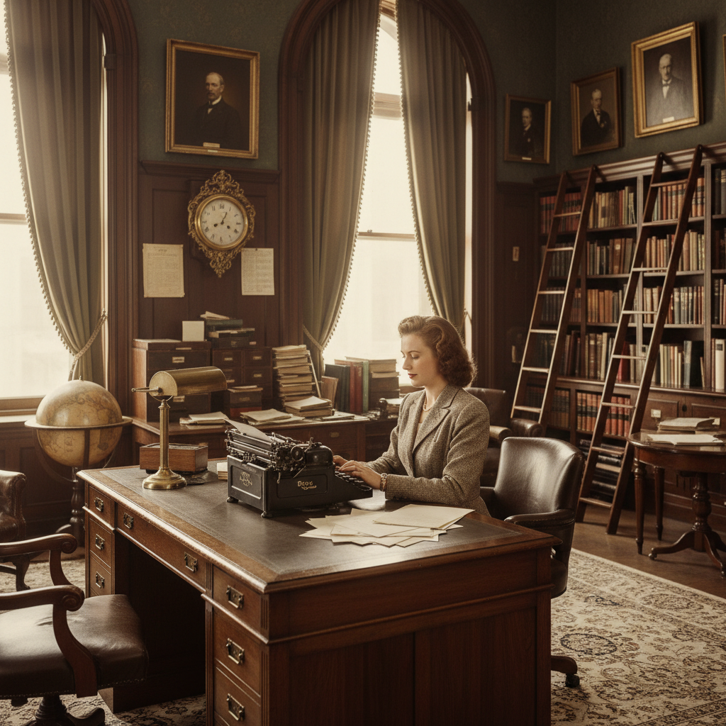 Alt text: Historic insurance secretary working with typewriter and documents in an old insurance office, illustrating early admin tasks.