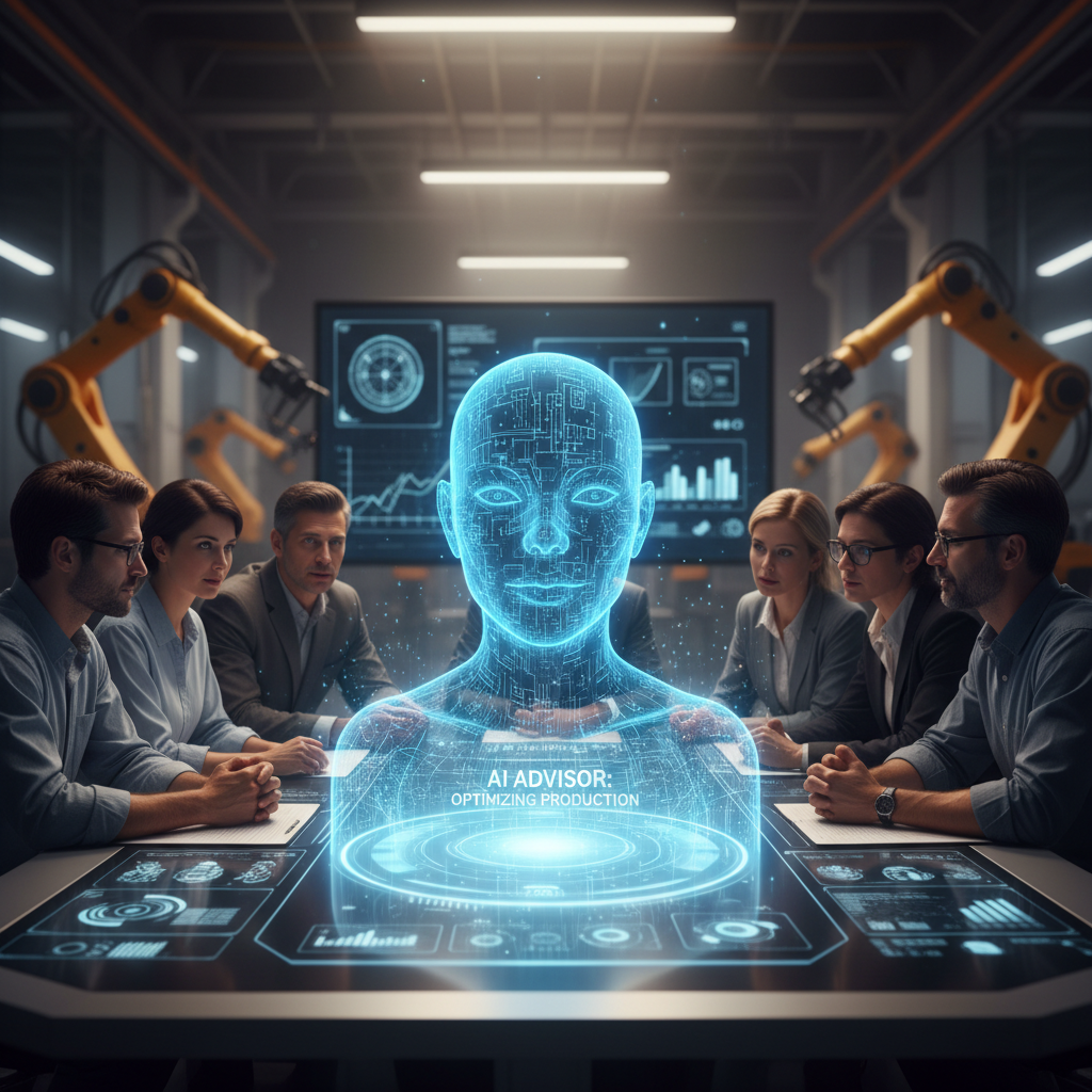 Alt text: diverse manufacturing team in a factory meeting, collaborating with guidance from a virtual AI advisor using intelligent enterprise collaboration tools