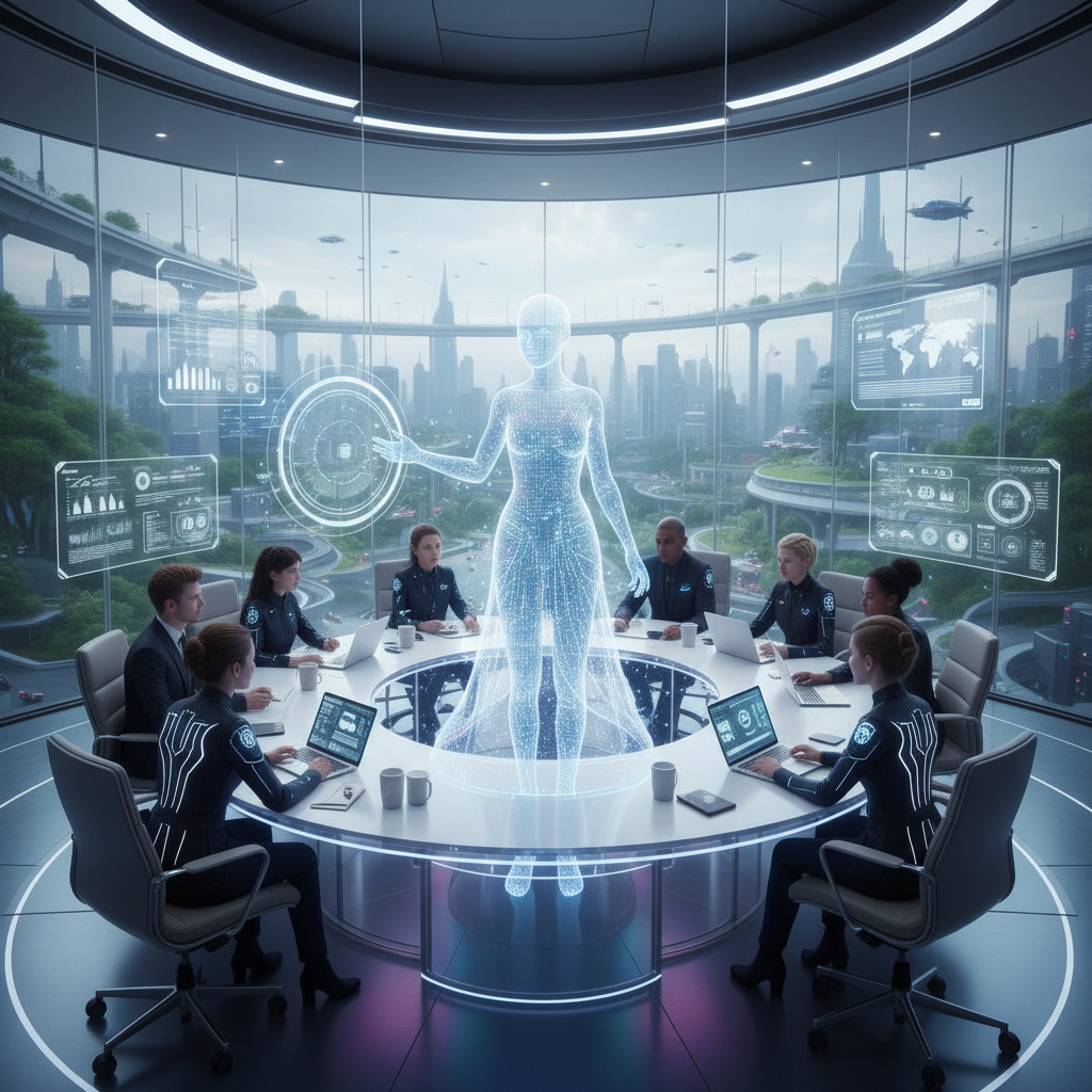 Alt text: futuristic office with humans and holographic AI working side by side, representing the rise of intelligent enterprise collaboration tools