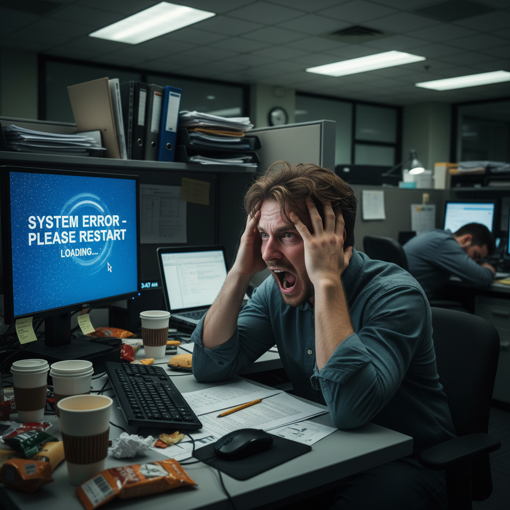 Alt text: Stressed worker facing endless IT problems, psychological impact of poor IT assistance.
