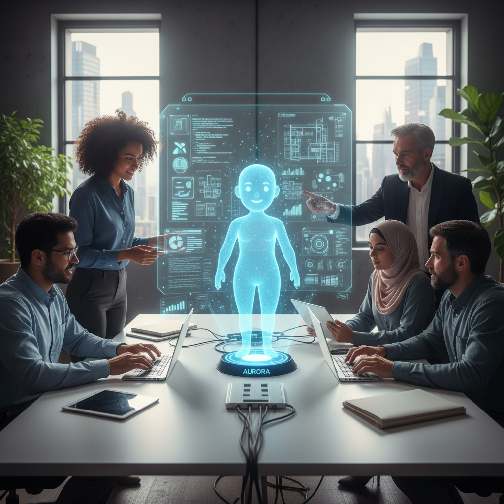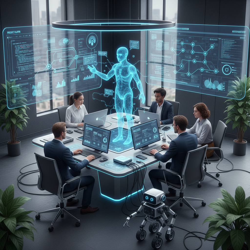 Alt text: Modern team collaborating with digital coworker displayed on screen, showing IT assistant integration and workflow.