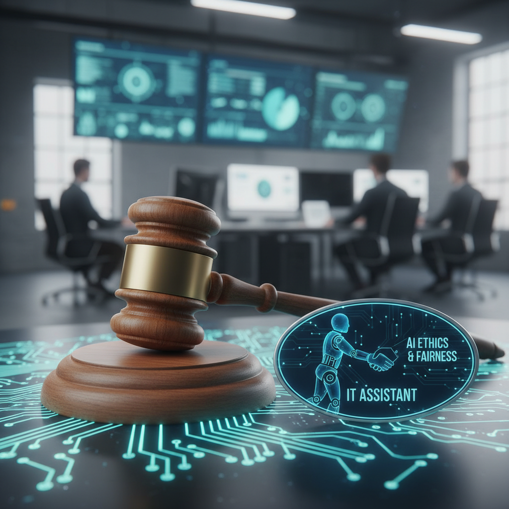 Alt text: Symbolic image of gavel, circuit board, and office badge illustrating ethical debate over AI in workplace.