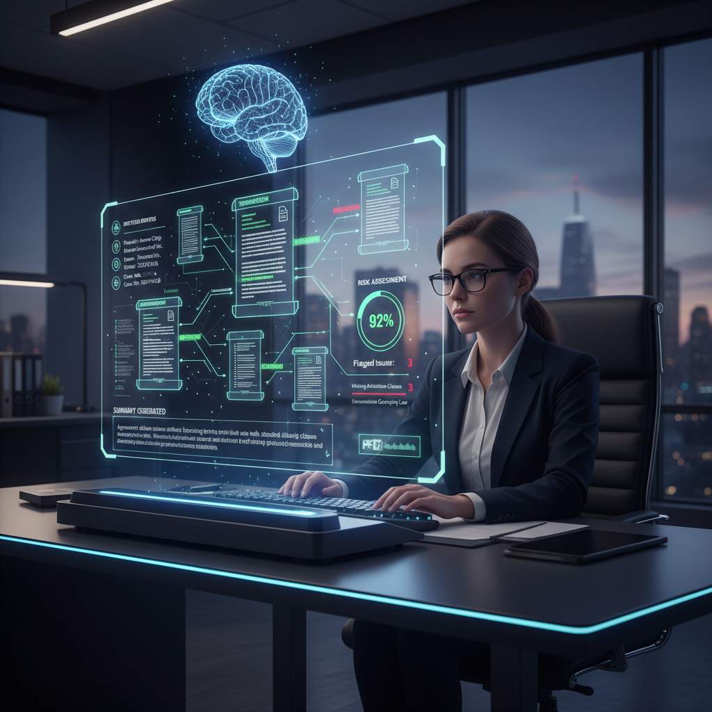 Alt text: AI-powered legal assistant analyzing documents on digital screens in a modern law office.