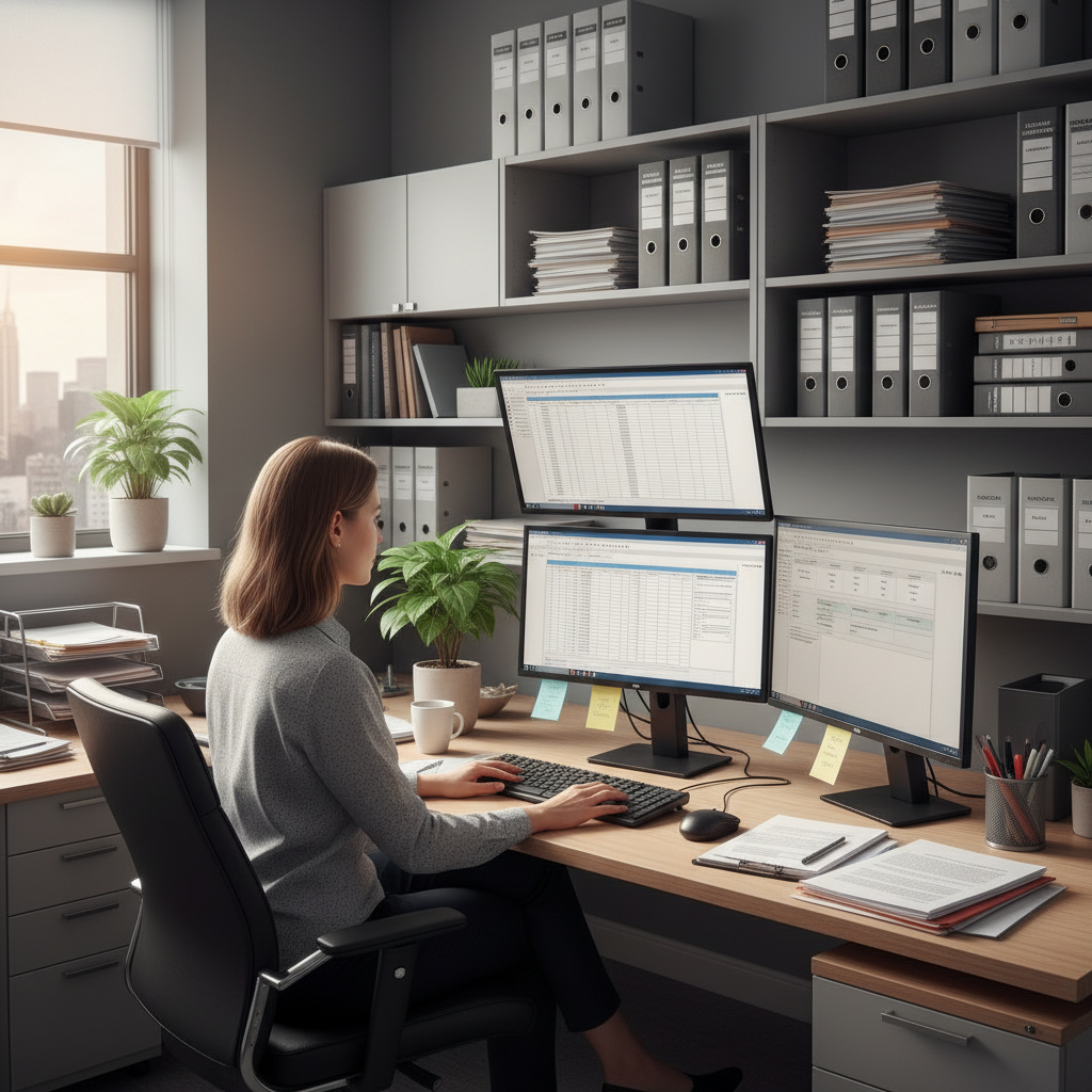 Alt text: Legal assistant multitasking in a bustling office with files and digital screens, showcasing their essential role in law firms.