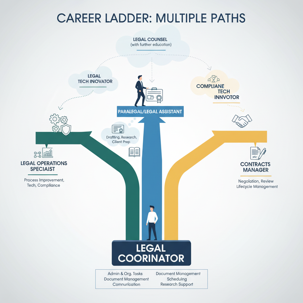 | Legal Coordinator | Workflow, compliance, project management | Ops, tech, multitasking, comms | Paralegal, Admin |