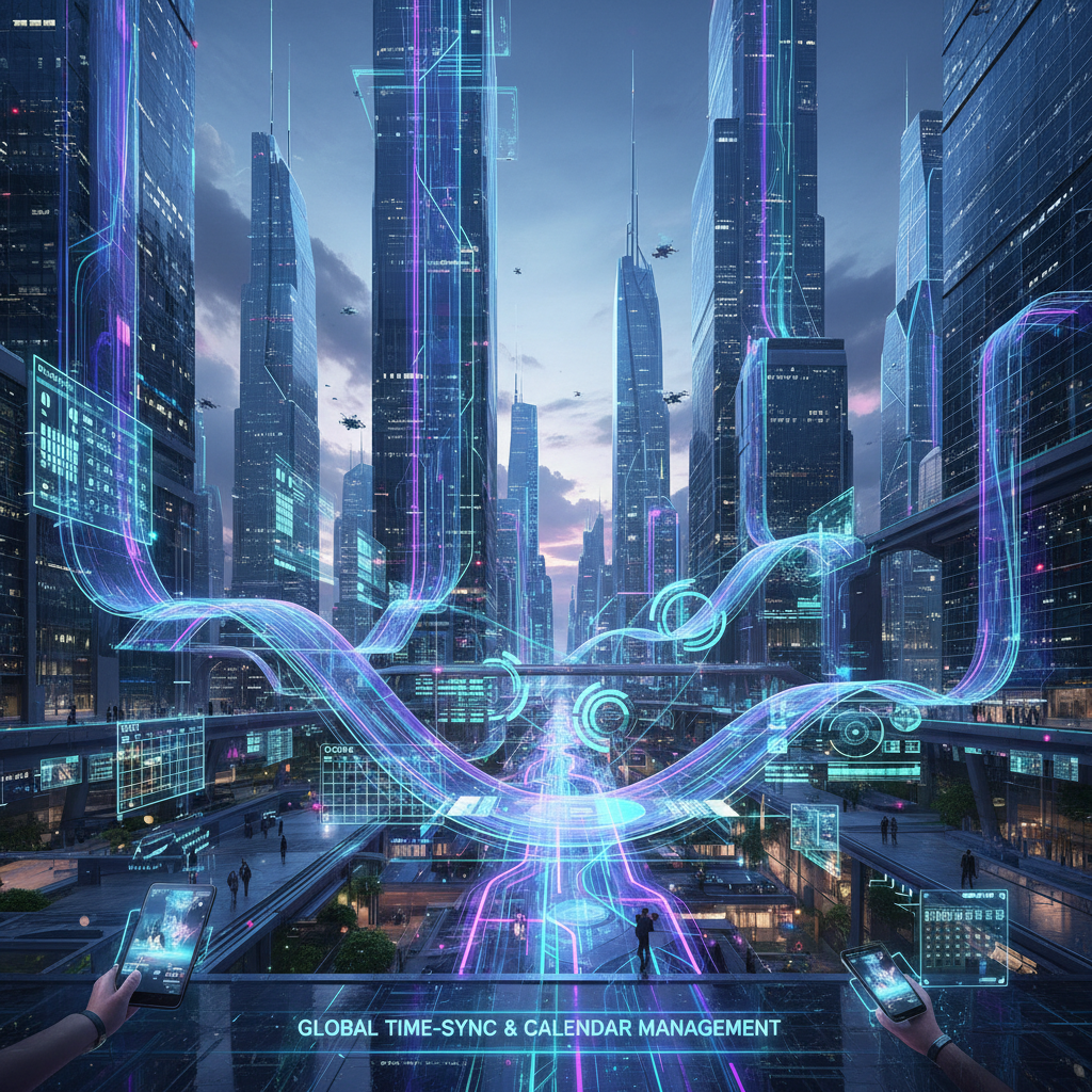 Alt text: Futuristic cityscape with digital time streams weaving between buildings, symbolizing AI-powered calendar management future