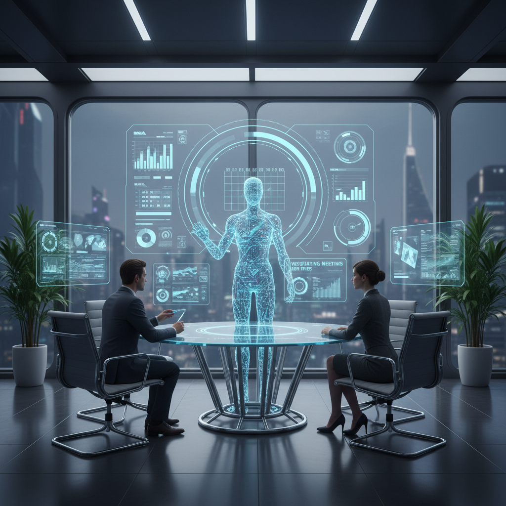 Alt text: AI-powered teammate manages team calendar, futuristic office setting, digital hologram negotiating meetings