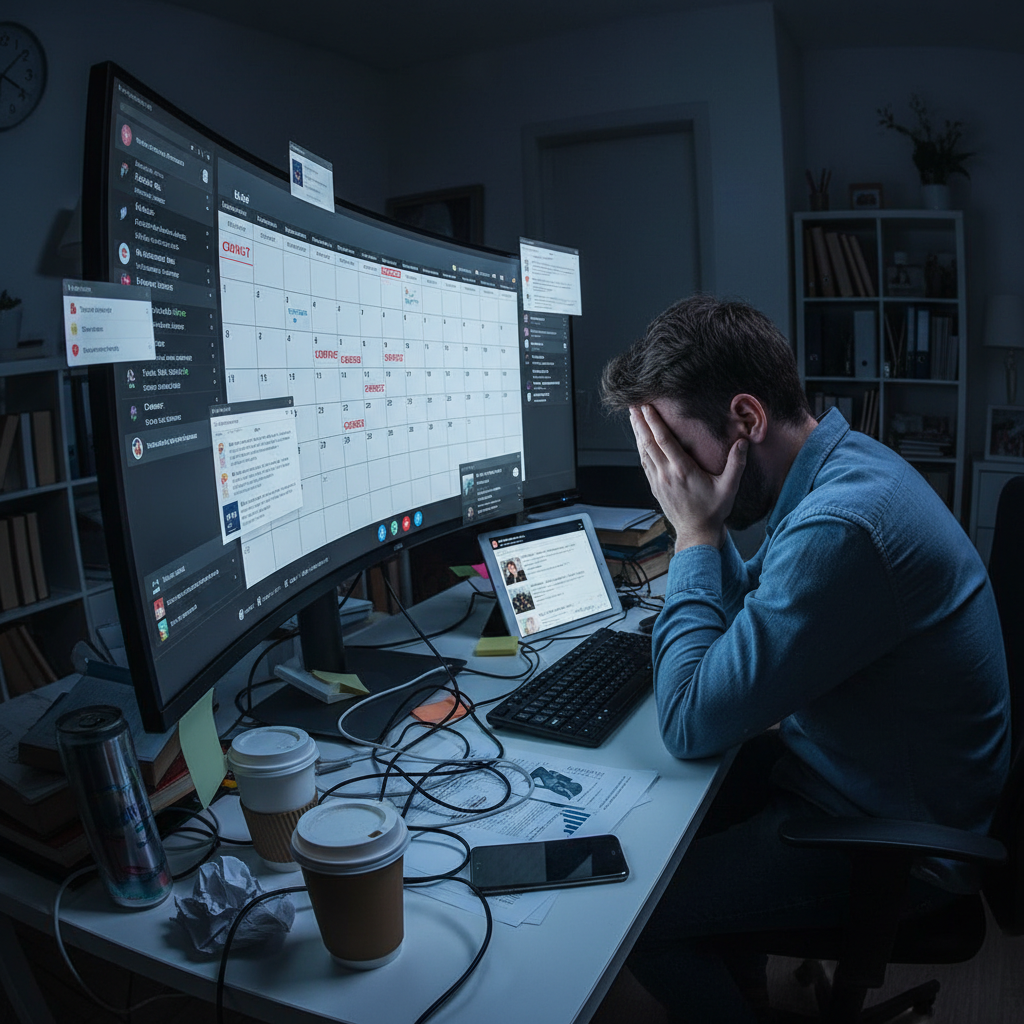 Alt text: Overwhelmed professional with chaotic calendar, digital overload, productivity crisis, looking for calendar management solution