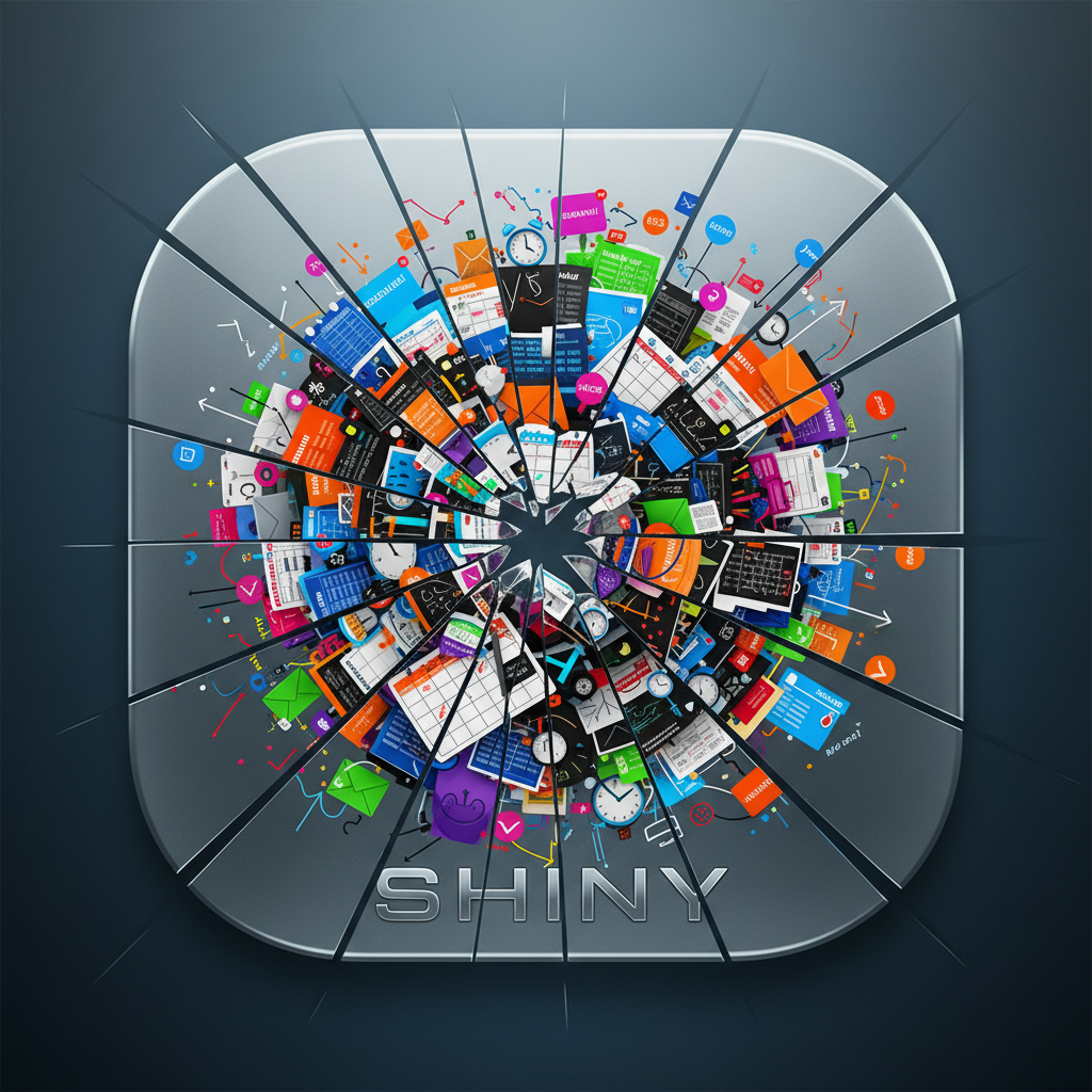 Alt text: Shiny productivity app icon shattering to reveal chaotic schedules beneath, showing calendar management struggles