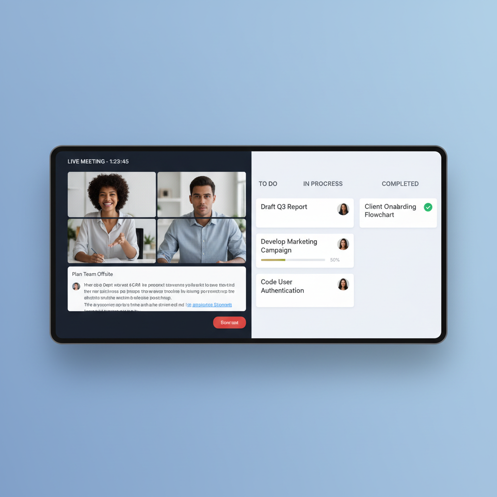 Alt text: Split-screen of live video meeting versus async task board, illustrating async work and calendar management integration