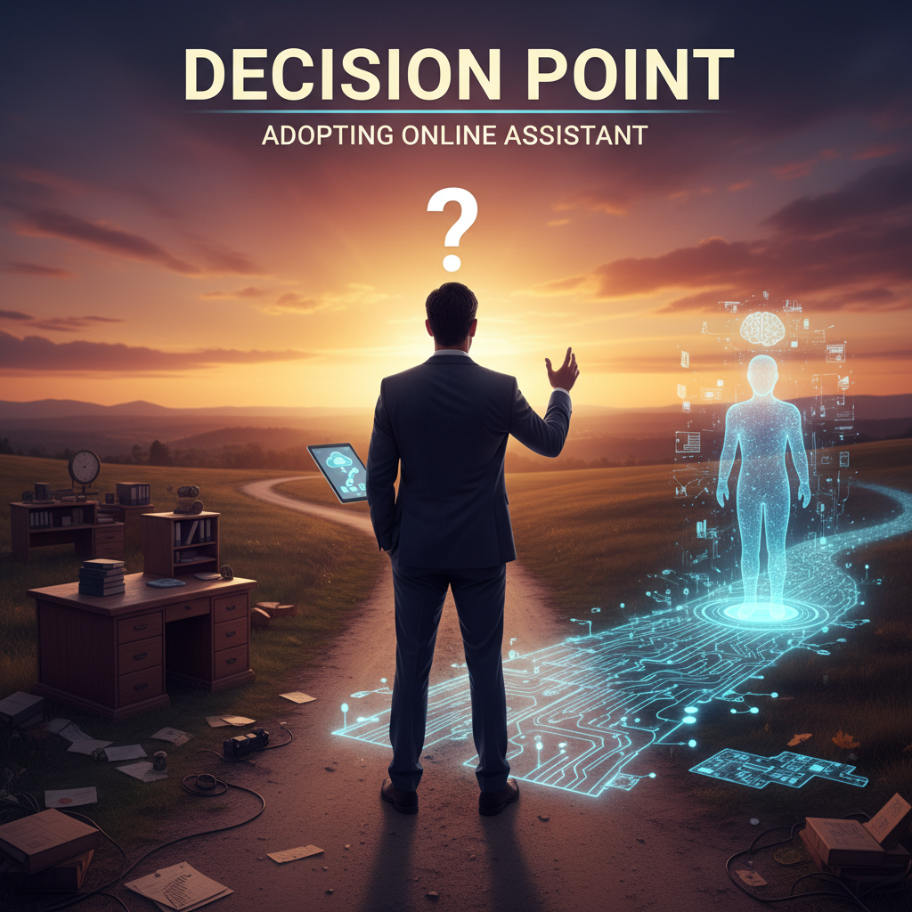 Alt: Editorial photo of a lone professional at sunset, digital interface glowing beside them, symbolizing the decision to adopt an online assistant for enterprise productivity.
