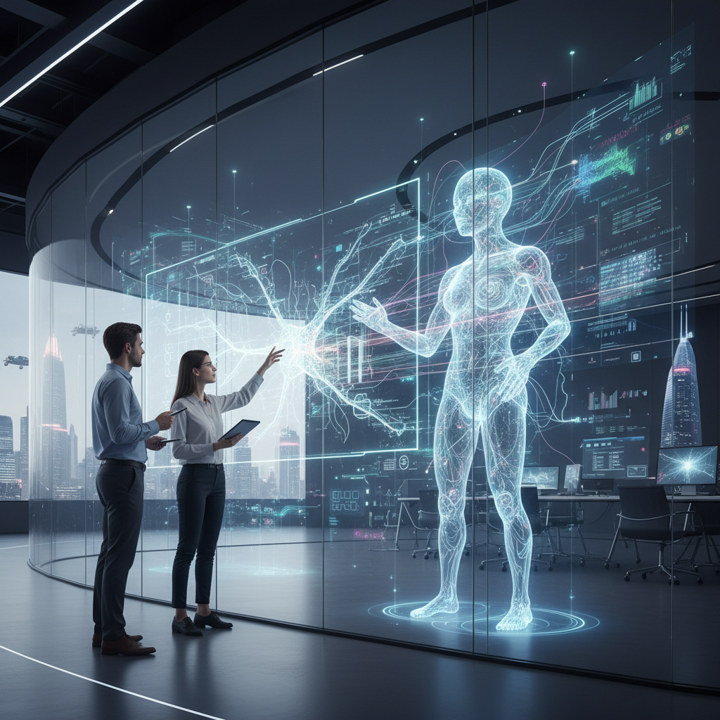 Alt: Futuristic photo of an AI hologram projecting data insights, emphasizing cutting-edge capabilities of online assistants.