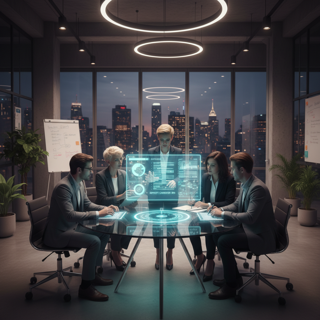 Alt: Confident team of decision-makers in boardroom reviewing digital dashboard, symbolizing the new rules of report creation