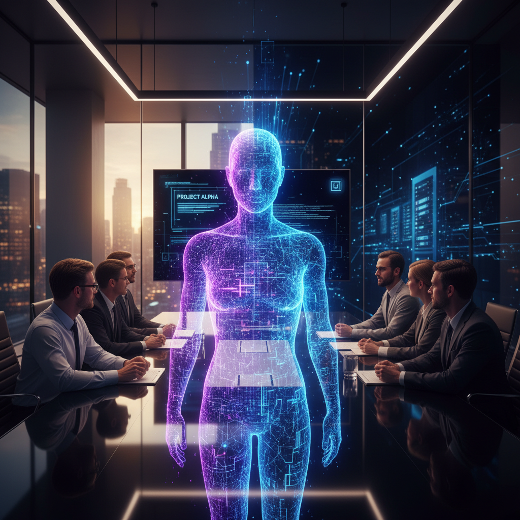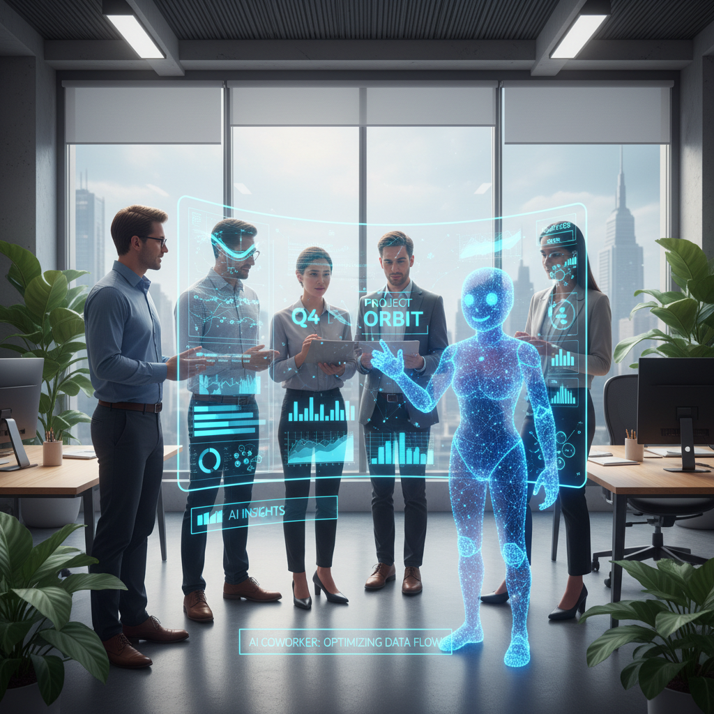 Alt: AI coworker joining the team meeting, digital avatar collaborating with humans, high-contrast, temporary professional focus
