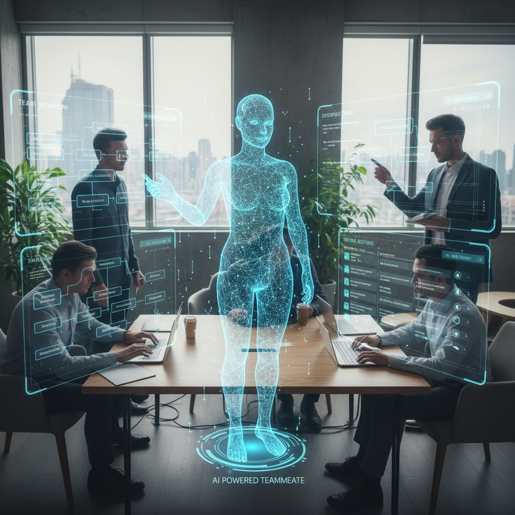 Alt: AI-powered teammate streamlining enterprise tasks, digital assistant, team workflow, temporary professional concept