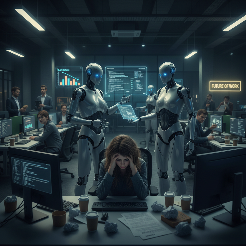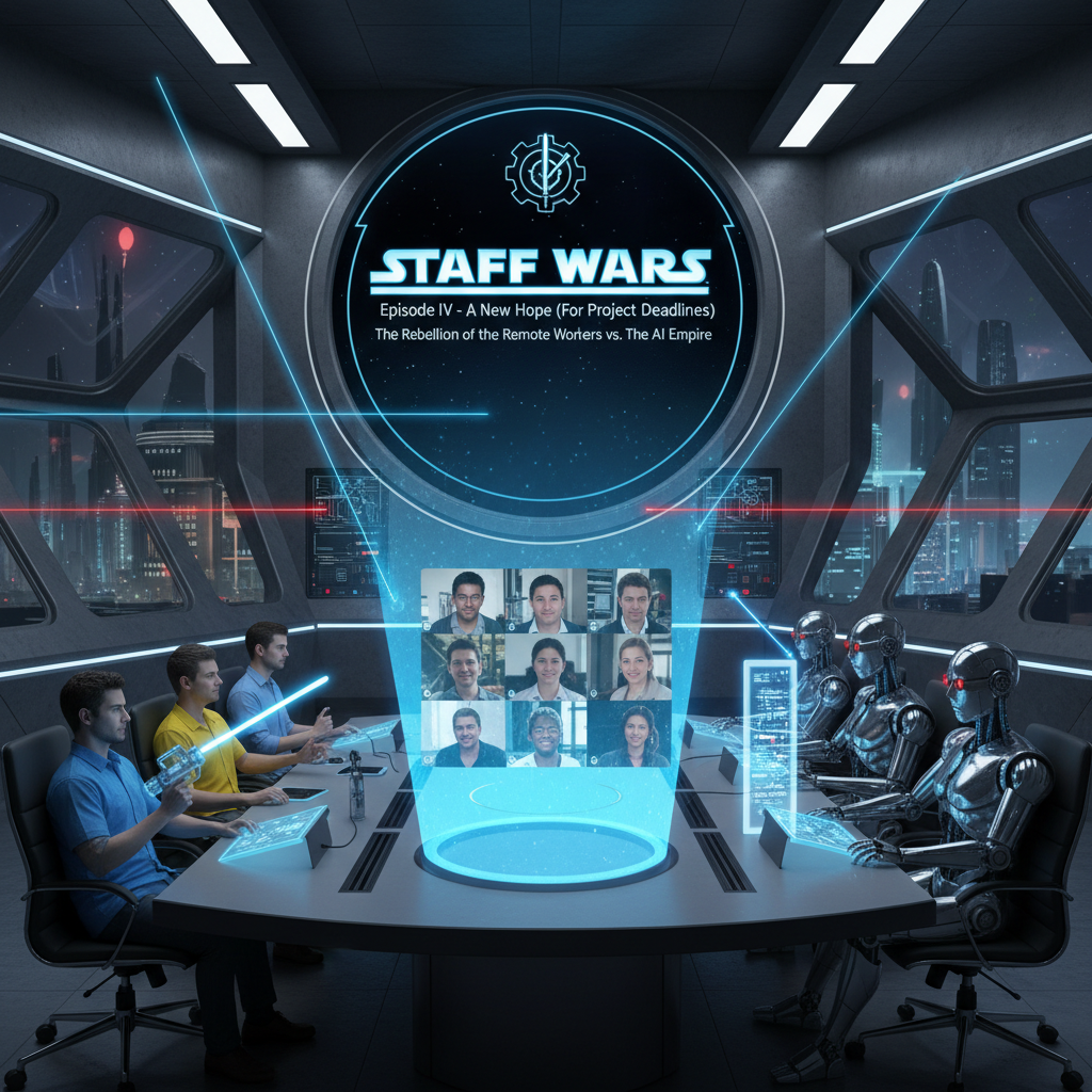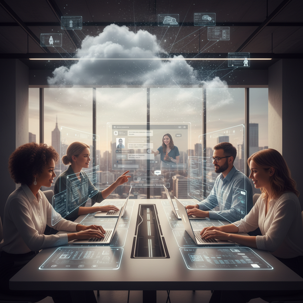 A mix of human employees, remote freelancers, and AI-driven coworkers, working in seamless digital sync.
