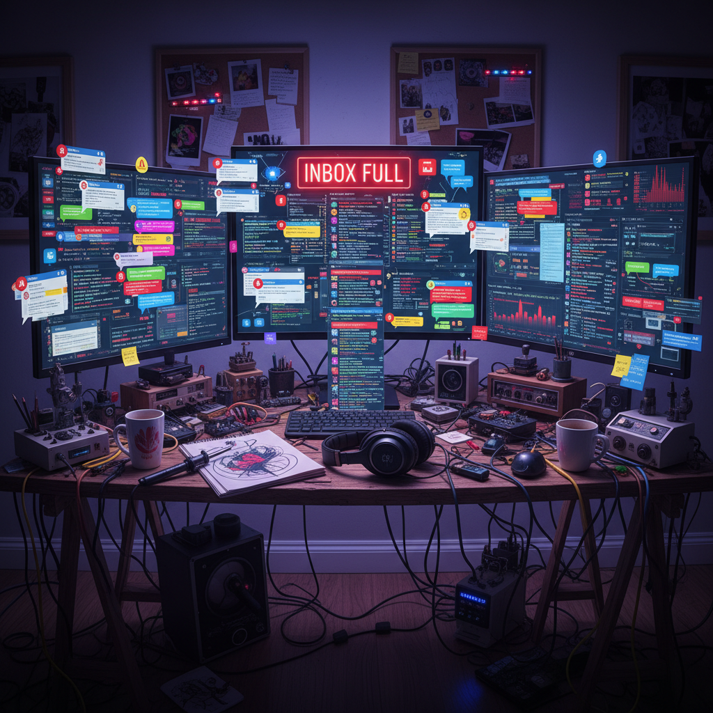 Photo: A creative, energetic desk scene with digital alerts, showing controlled email chaos.