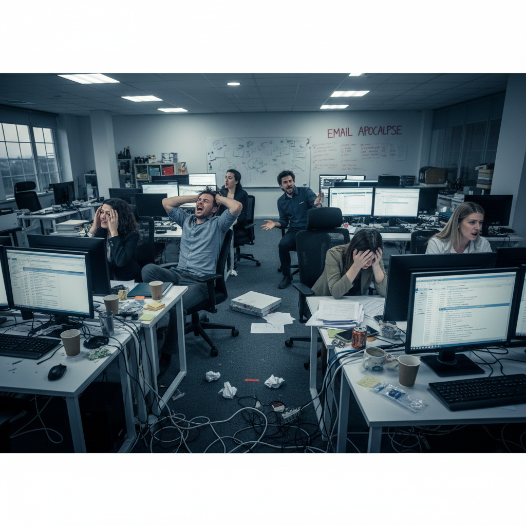 Photo: A frustrated team surrounded by laptops, tense but with a hopeful air, battling email overload.