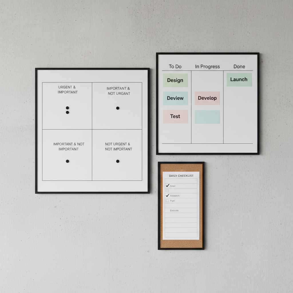 - Kanban + Eisenhower: Prioritize cards by urgency/importance, not just project stage.