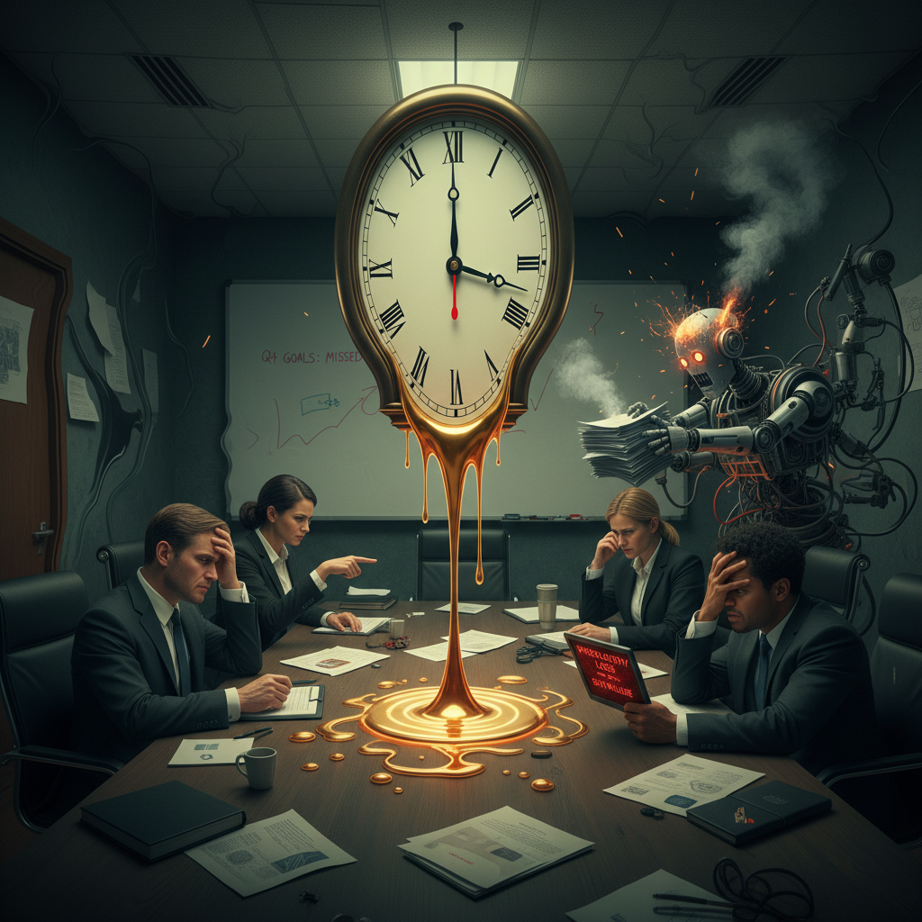 Wasted time in meetings visualized by melting clocks in a tense boardroom.
