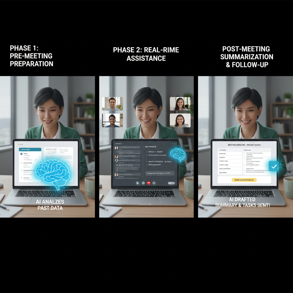 Three stages of AI-driven meeting assistance: before, during, and after.