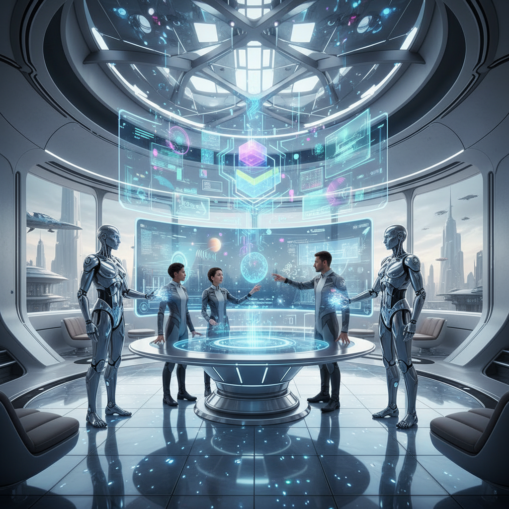 Alt text: Office of the future blending holographic AI tech and human interaction for optimized meetings.