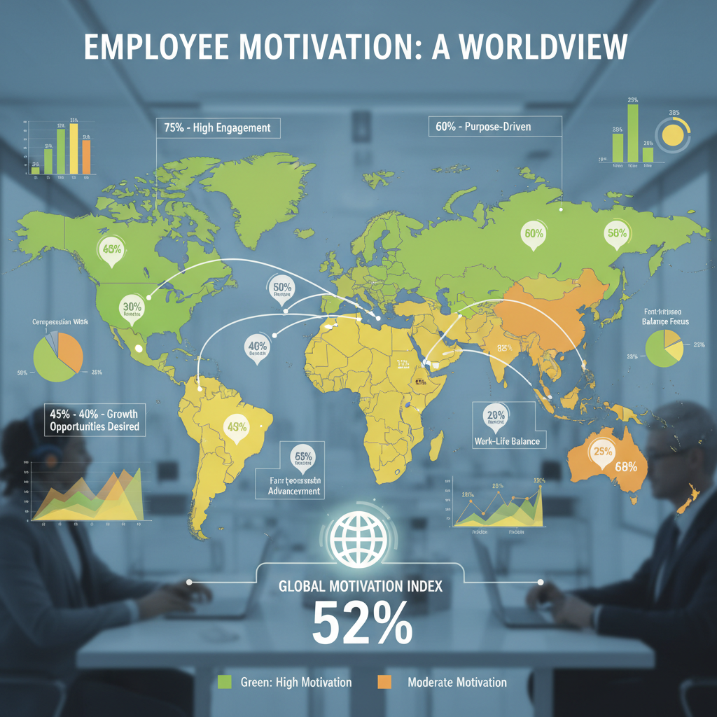 World map with heat zones showing employee motivation by country—emphasizing global disparities in engagement.