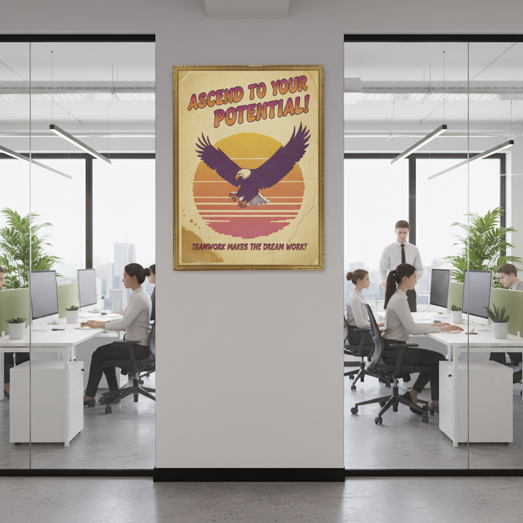 Outdated motivational poster being removed in a modern workspace, symbolizing the death of old management models and the rise of new employee motivation strategies.