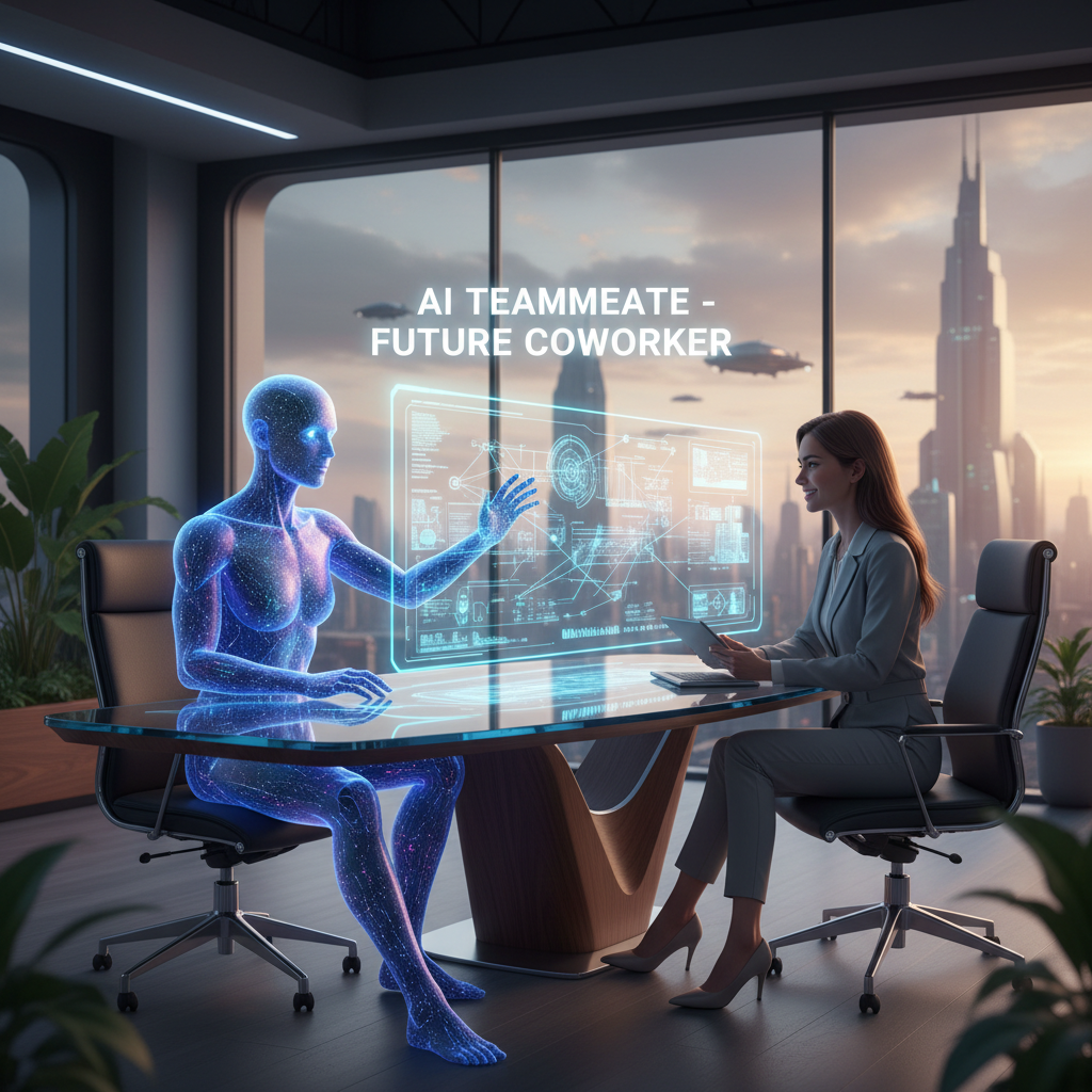 Alt: AI teammate in digital workspace, blending with humans, need employee solution photo