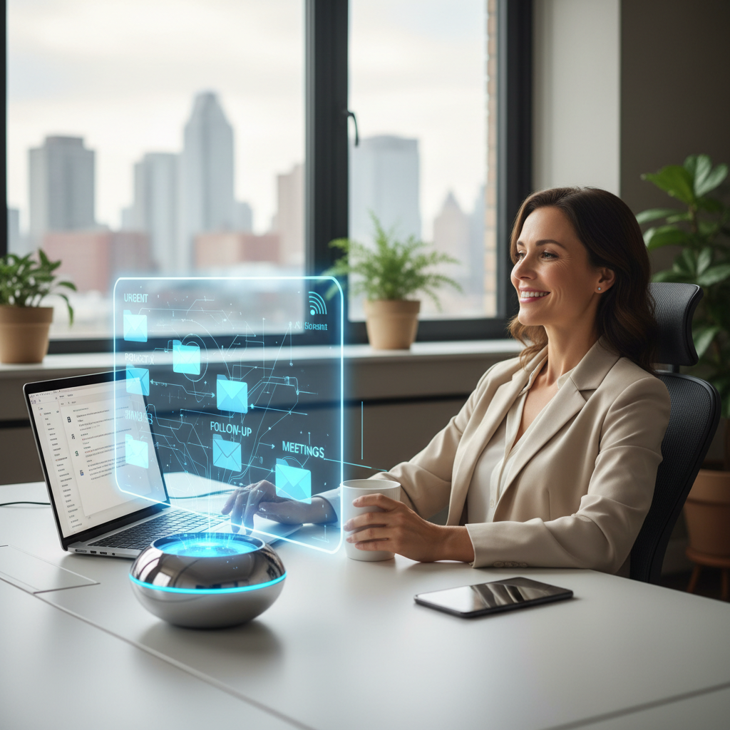 Alt text: AI assistant sorting emails while manager watches relieved, email overload solution.