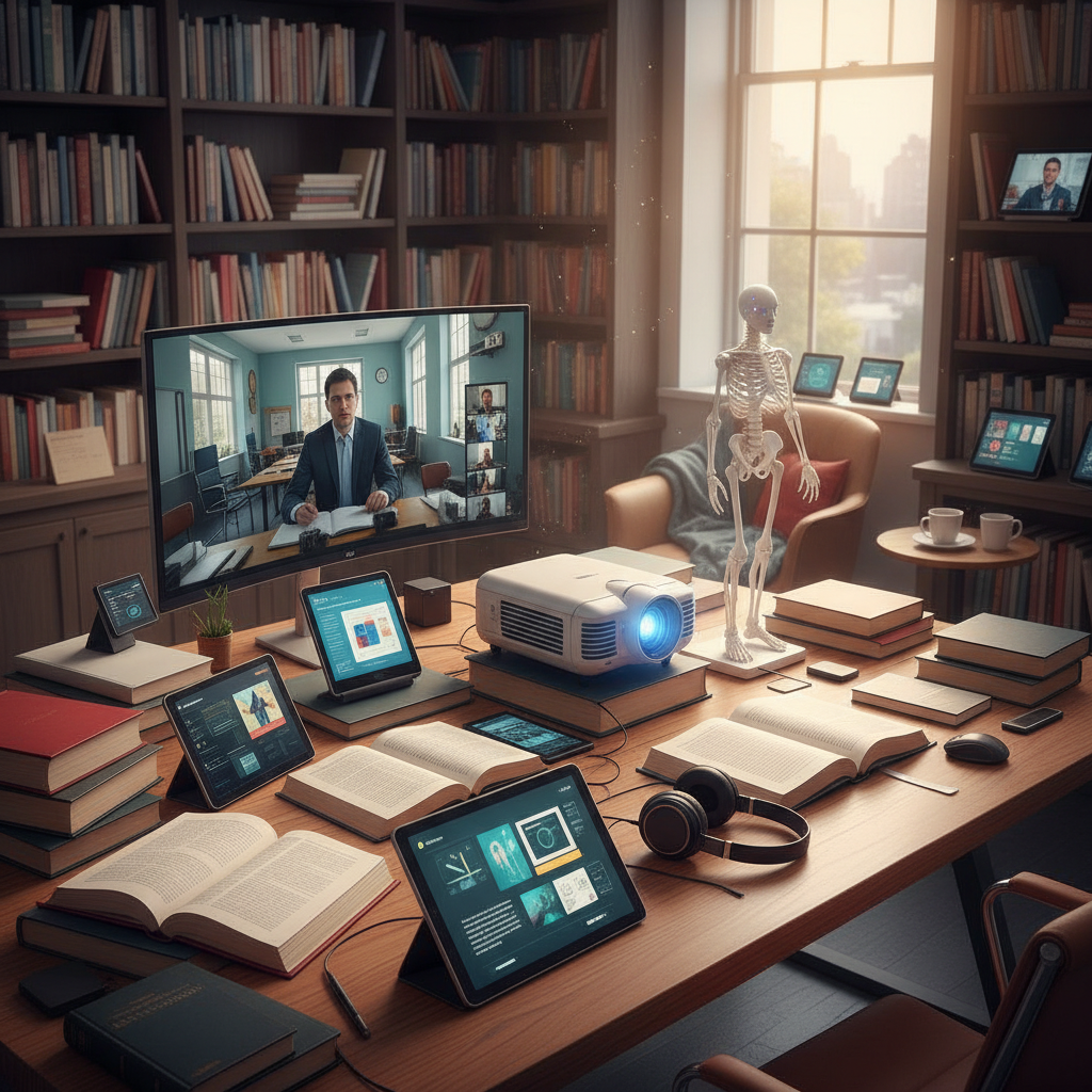 Alt text: Books and digital devices symbolizing learning and customer management resources.