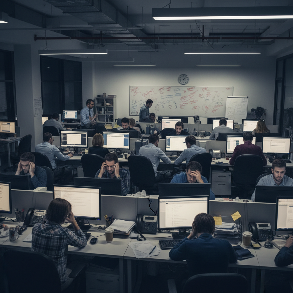 Alt text: Team in open office with visible stress and burnout, customer management crisis.