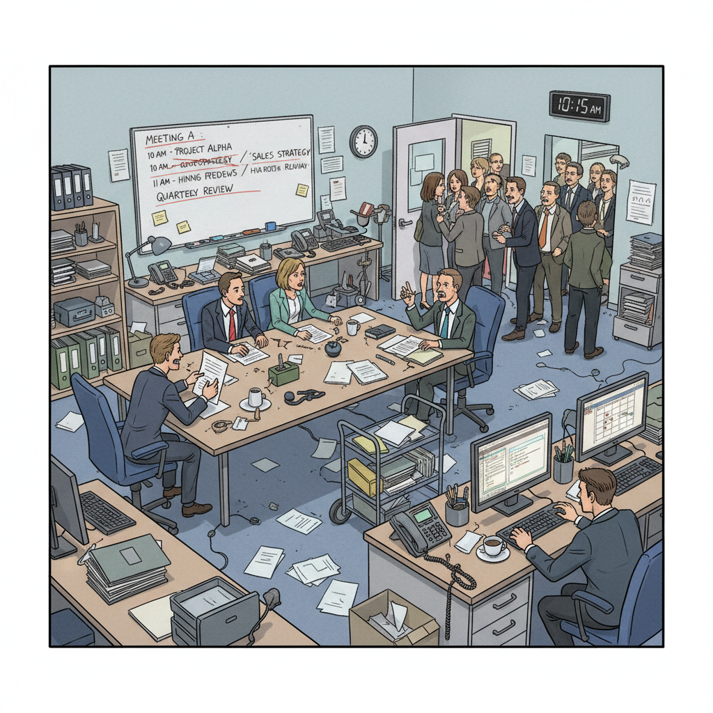 - “Reply all” wars: Scheduling becomes a gladiatorial contest in the inbox, with everyone fighting for their slot.