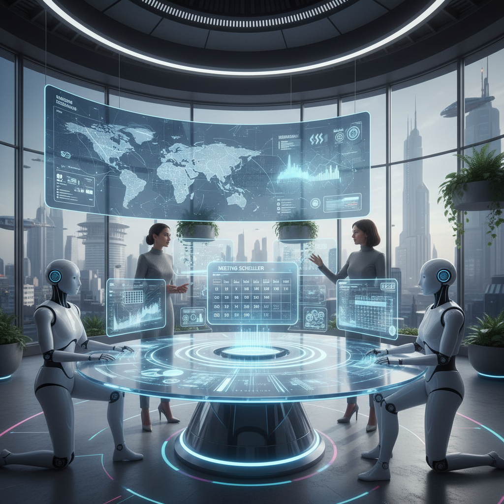 Photo of a cutting-edge workspace where humans and AI collaborate seamlessly on meeting scheduling.