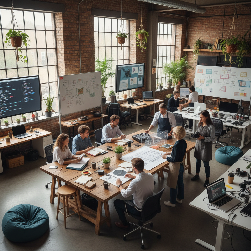 Creative snapshot of a diverse, cross-industry team brainstorming innovative hiring solutions