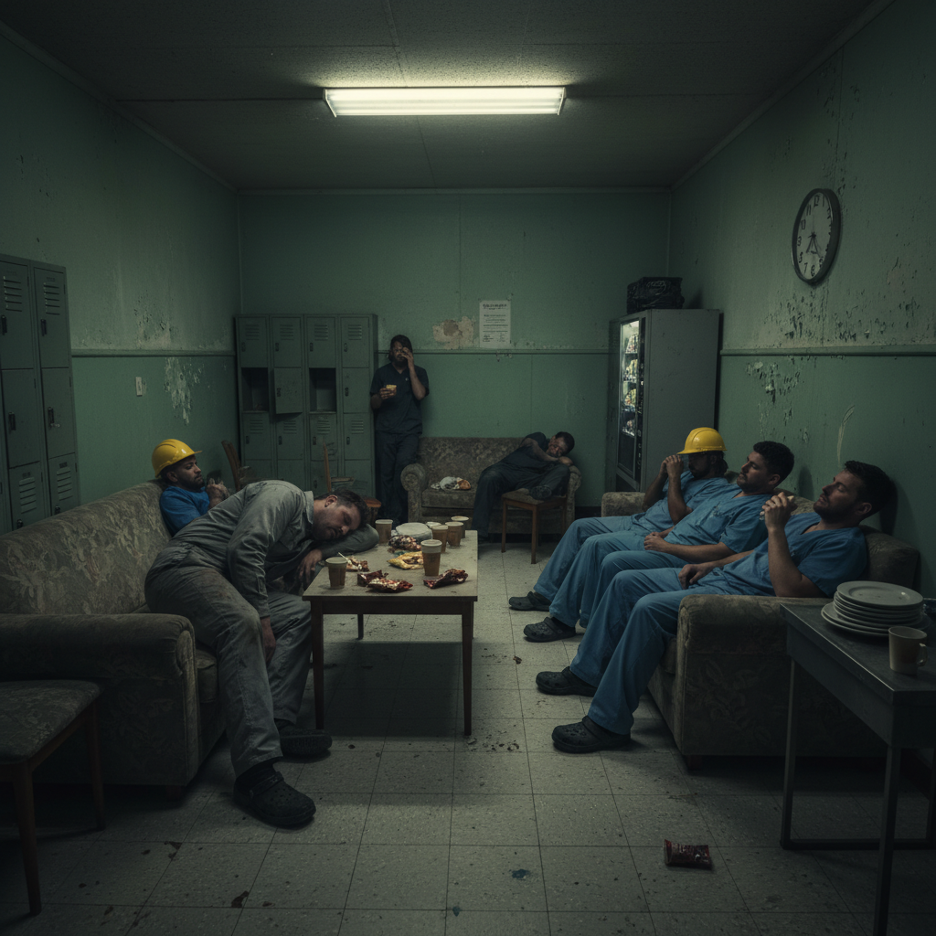Exhausted workers regrouping in a break room, embodying the human cost of the ongoing labor crisis