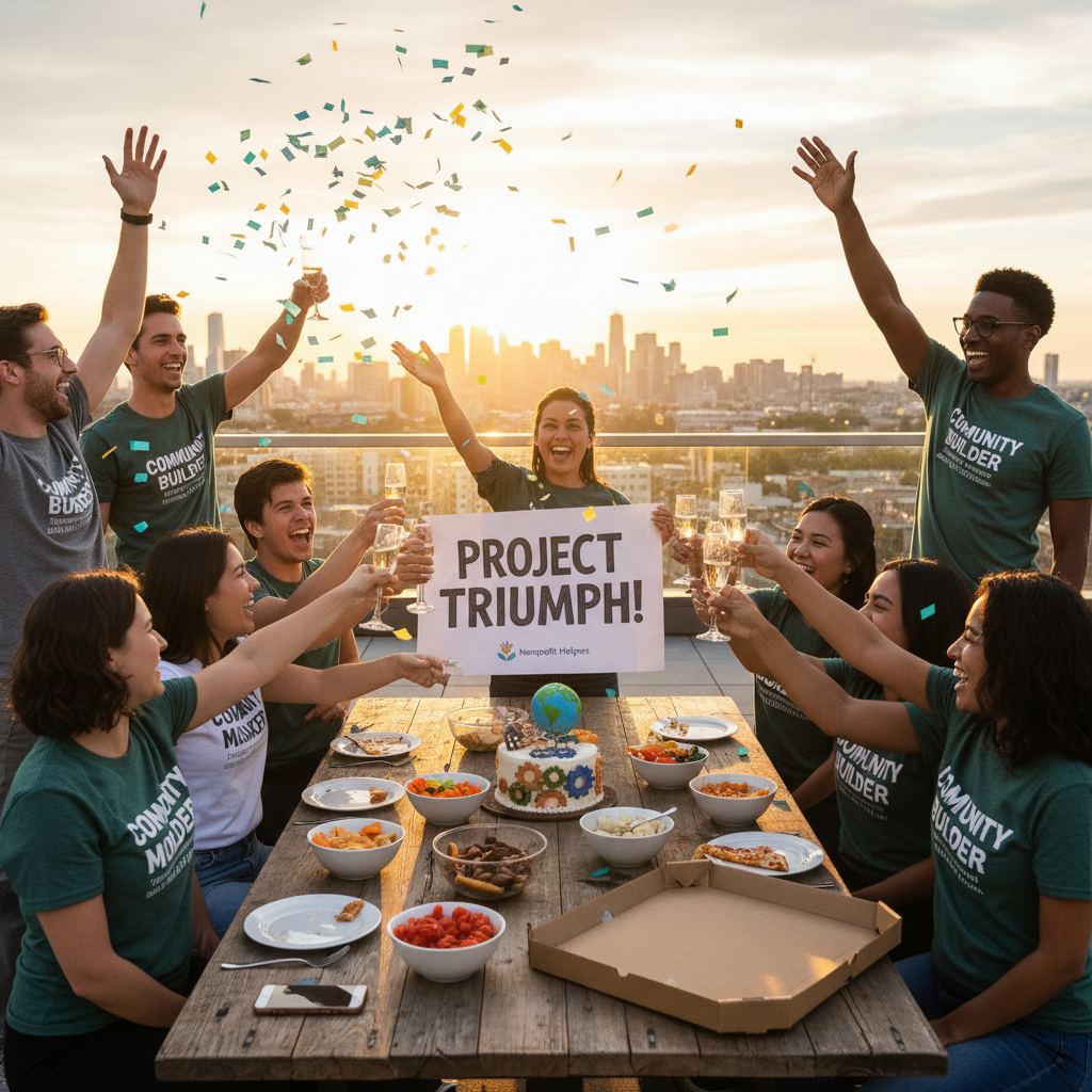 Empowered nonprofit team celebrating a successful project, with AI-powered helper in the background.