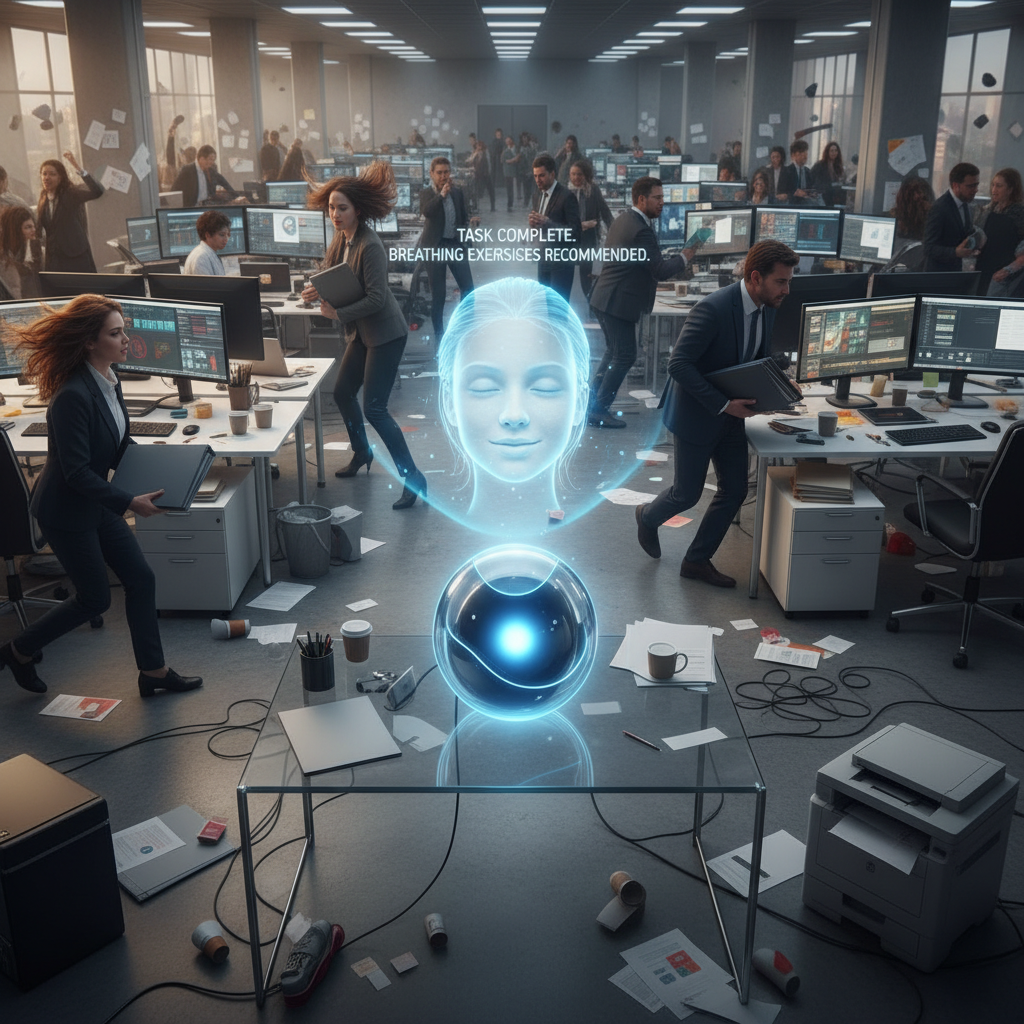 Alt text: Chaotic office with papers and screens dissolving into calm, organized space as a digital AI office helper intervenes.