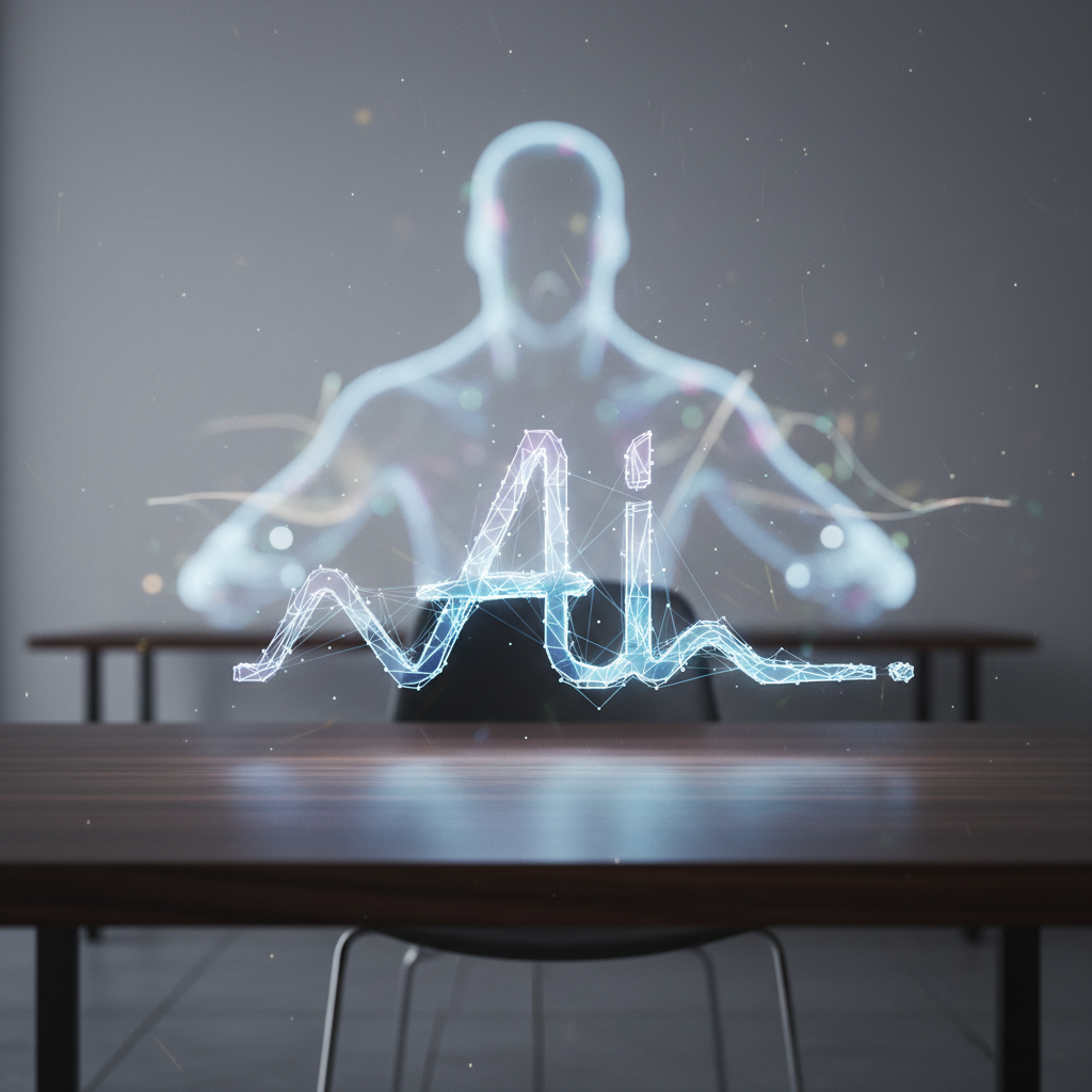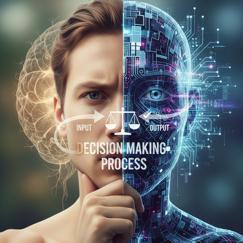 Alt text: Symbolic photo split between human and digital figure, both making the same thoughtful gesture, representing human-AI decision making in office workflow.