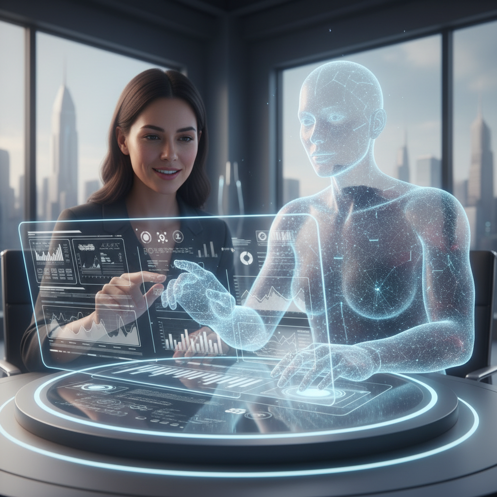 Alt text: Confident human office worker collaborating with a digital AI teammate, both contributing ideas at a modern desk.