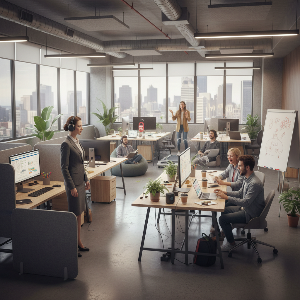 | Workspace design | Cubicles and personal desks | Hot-desking, crowded "collab zones" |