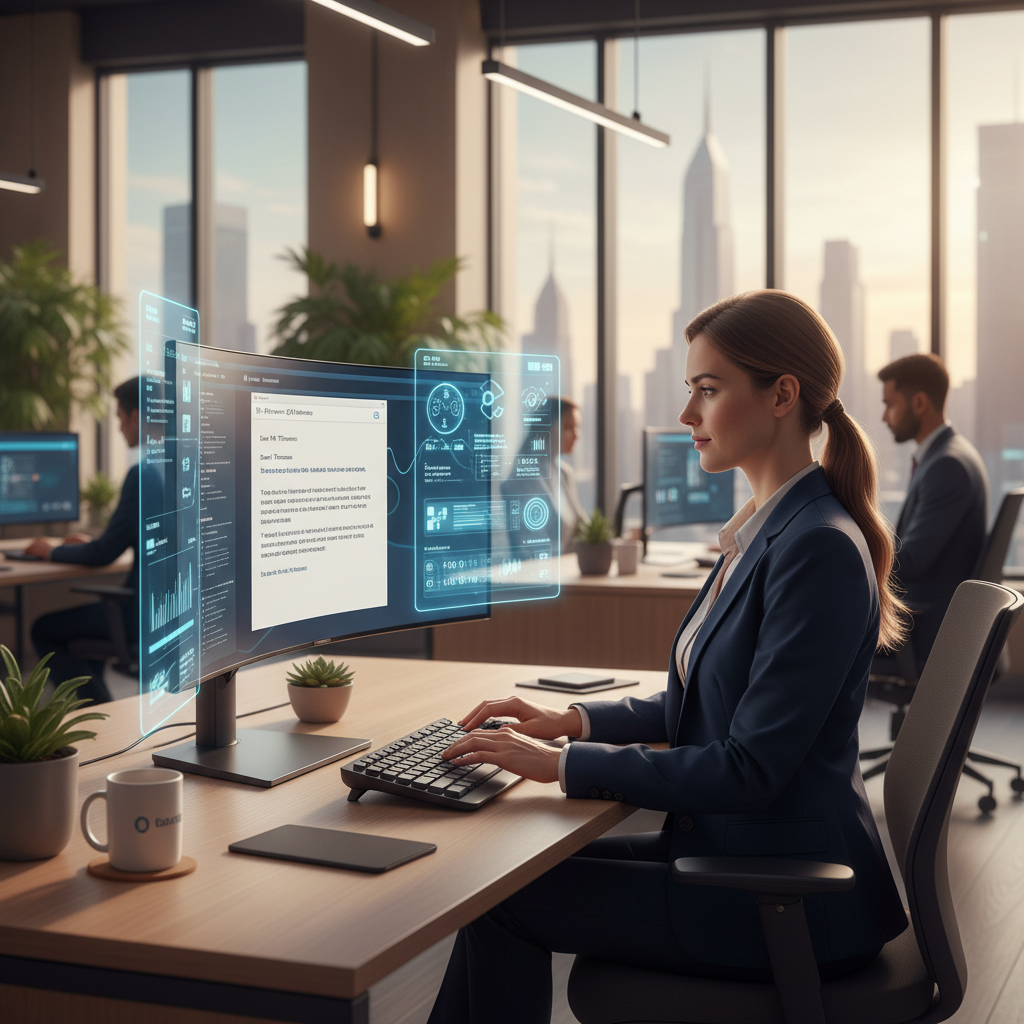 Alt: Employee composing a professional message in a digital office showcasing modern office professionalism