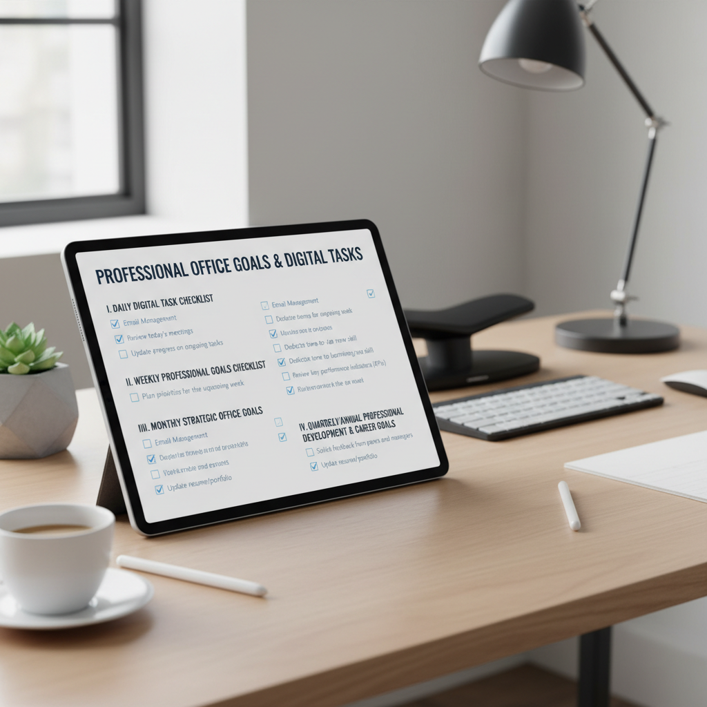 Alt: Professional achieving checklist goals, demonstrating mastery of office professionalism in an organized workspace