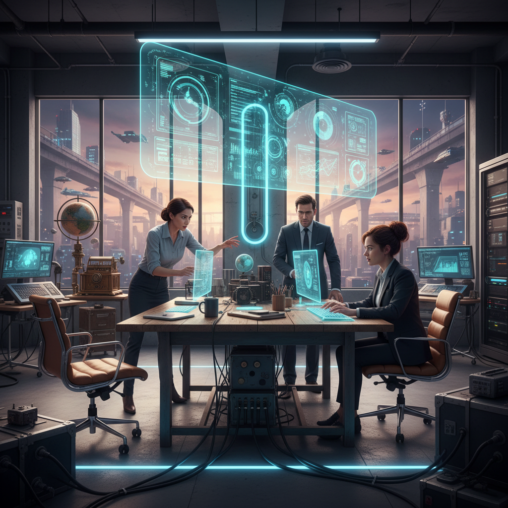 Blending past and future in office services: Vintage items meet futuristic tech, a narrative office scene highlighting collaborative evolution.