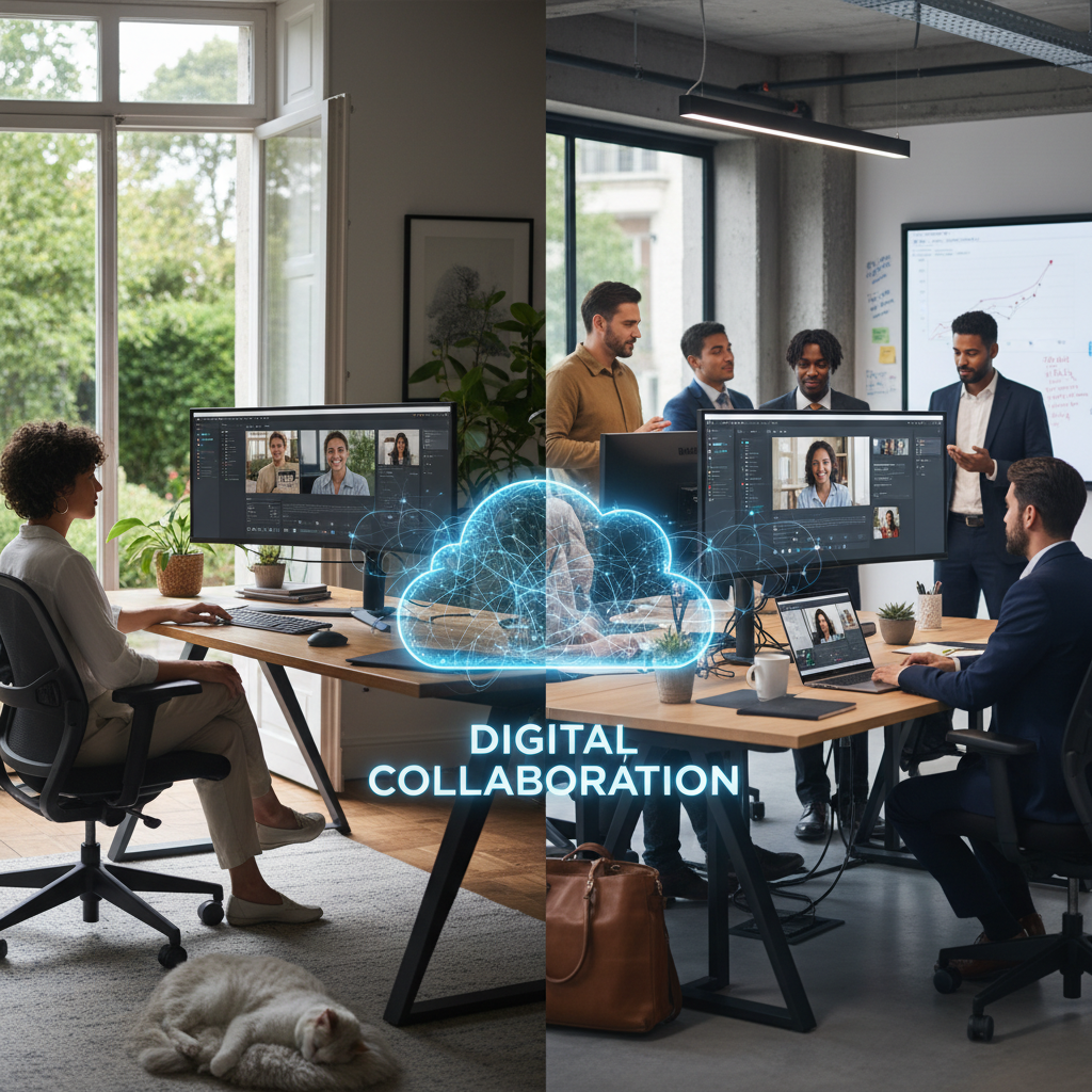 Alt: Hybrid office worker environments with digital tools, showing contrast between home and corporate settings.
